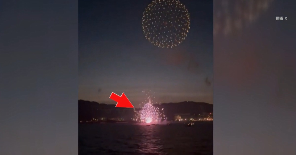 絢爛的煙火點亮夜空,但突然有一束火花在地面炸開來,拍攝民眾意外驚呼,也有人以為只是設計好的橋段。