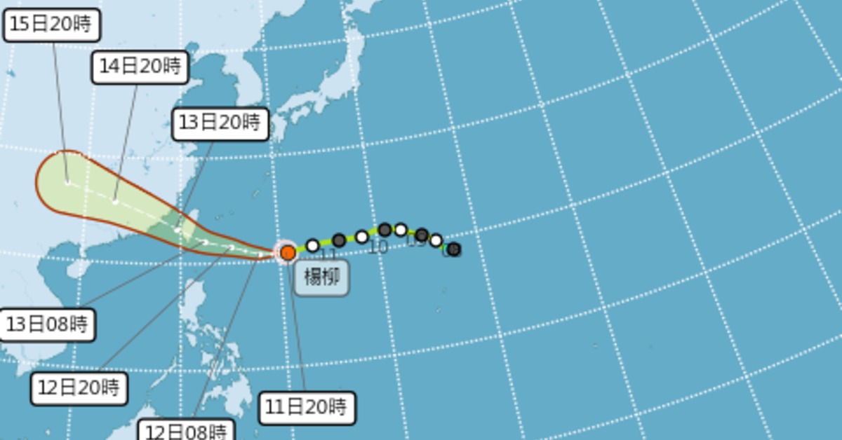 中央氣象署指出,第11號颱風楊柳已經從輕度颱風升格為中度颱風,週三影響台灣最劇,而登陸地點以南花蓮至台東機率較高,最快今(11)日深夜至明晨發布海上颱風警報,並於明日中午至下午發布陸上颱風警報。