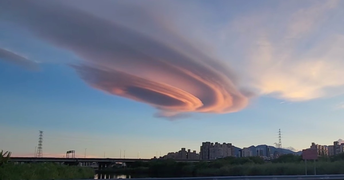 不過專家表示,俗稱飛碟雲的莢狀雲,中央厚周邊薄,呈現凸透鏡形狀,有時會一層層地疊在一起,當一股穩定且潮濕的氣流吹過山丘,會呈現波浪狀上下擺動,氣流被迫抬升時,蒸氣遇冷而凝結成雲。