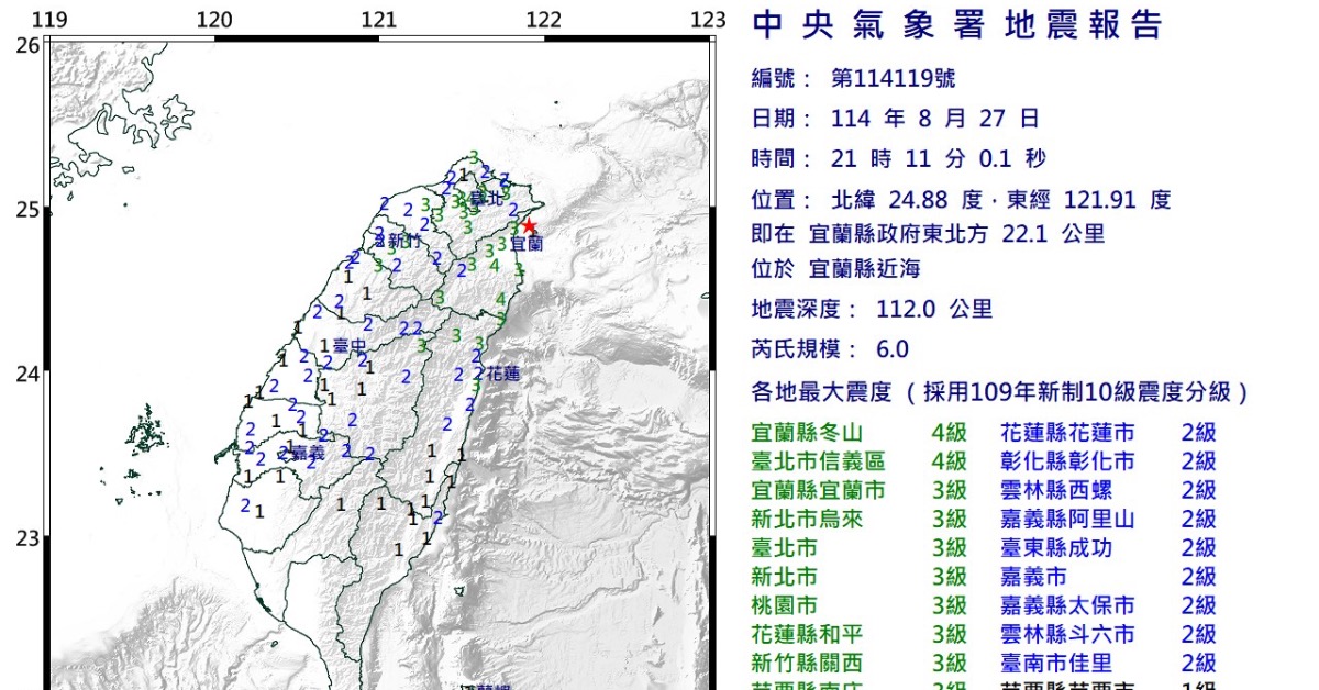 宜蘭昨晚(27日)發生規模6.0地震,恰巧遇上農曆7月5日,被網友聯想日本漫畫家龍樹諒「2025年7月5日大災難」的預言。(圖/翻攝自氣象署)