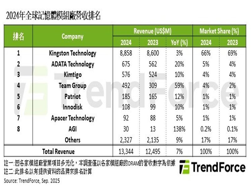 從TrendForce統計來看,2024年全球前五大記憶體模組廠占整體營收81%,前八大則囊括整體營收的83%。龍頭廠商Kingston(金士頓)的市占為66%,穩居領先地位,然而營收成長幅度落後同業,主要反映2024年下半年消費市場需求轉弱。Kingston持續堅守高端品牌定位,以確保獲利水準為優先的策略方向。