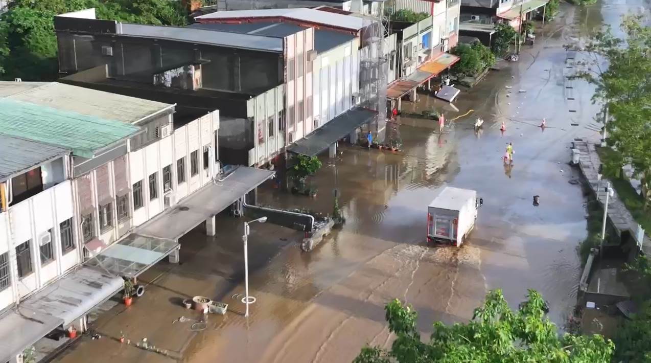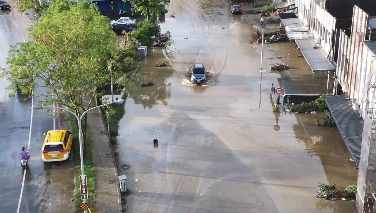 持續追蹤蘇澳災情,空拍畫面可見,蘇澳街道兩側仍有大量泥水,還有停放路邊車輛被沖到斜停路邊,導致車輛在大水退去後,宛如待被開單的違停車;而大水不只帶來泥沙,也在退去後留下滿地殘骸、垃圾。
