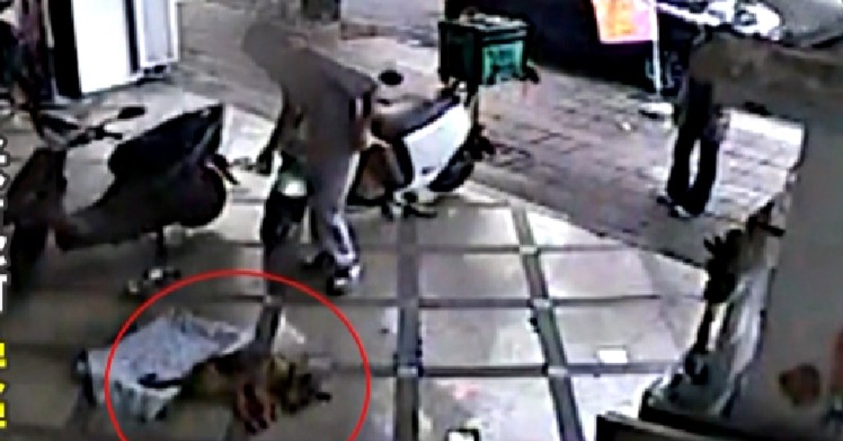 米克斯安安躺在騎樓休息,一對好心男女路過幫忙倒水,看到狗狗身上有傷口,以為無人看照,於是打電話通知動保處,隔半小時動保人員到場,先是蹲下來查看狀況,接著拿來一條被單,把狗狗包住抱起來帶走,飼主從遠端看監視器才發現愛犬不見了。