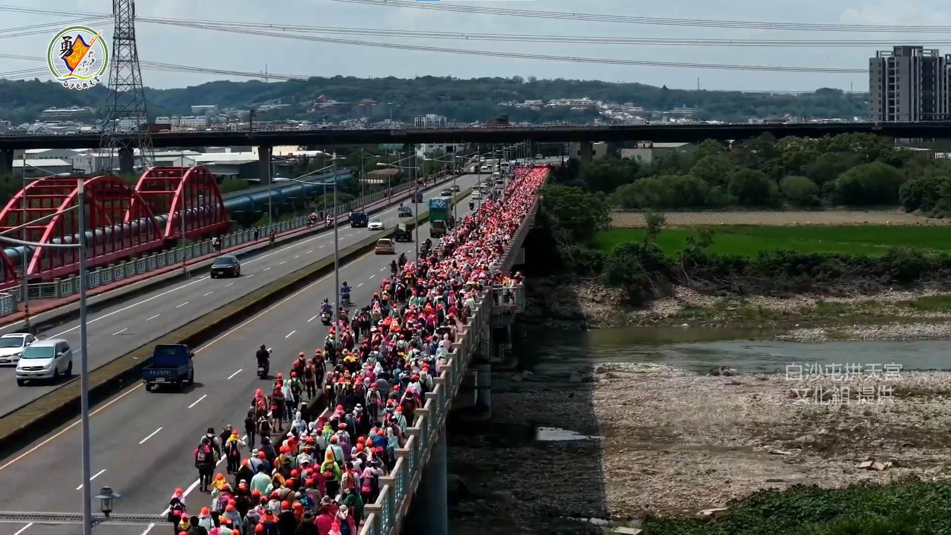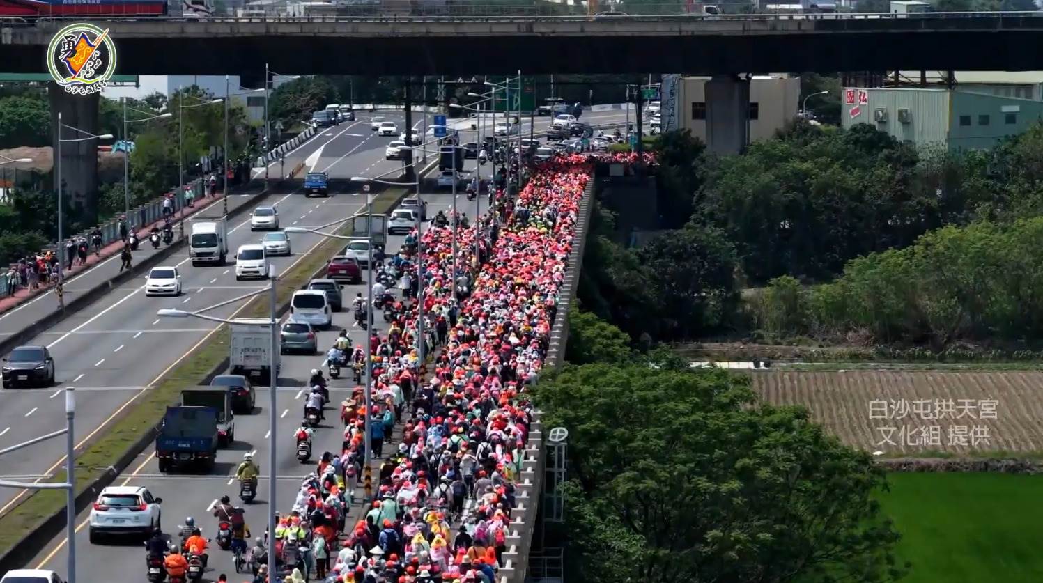 「粉紅超跑」走大度橋進入彰化了!大肚橋上擠滿隨行香燈腳,從空拍畫面可見綿延不絕的人龍,相當壯觀。